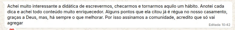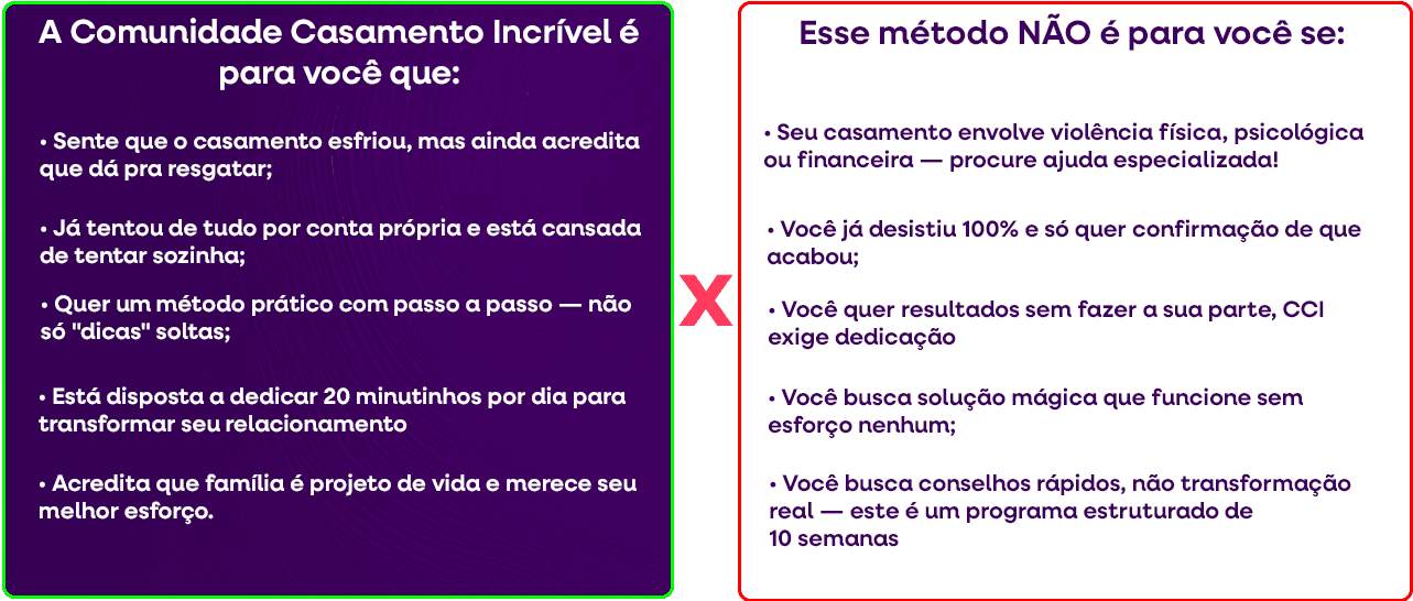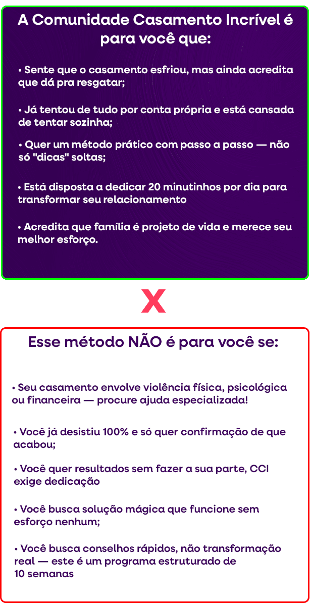 Sou mãe de 5 filhos, casada há 11 anos com o Nathan, servidora pública federal, e fundadora da Comunidade Casamento Incrível. Mas antes de tudo isso, eu fui uma mulher que quase desistiu. Que chorou sozinha achando que tinha escolhido errado. Que pensou "será que é só assim mesmo?" Que quase jogou a toalha mais vezes do que gostaria de admitir. Até que eu entendi uma coisa: Casamento não é sobre encontrar a pessoa perfeita. É quando você sabe onde colocar energia. E foi isso que eu fiz, testei, errei, ajustei e apliquei. Com 5 filhos, rotina caótica, trabalho, casa, vida real. Não em condições de laboratório, no caos do dia a dia e funcionou.